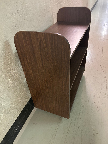 (1) Book cart. The item is classified in usable condition. The cart features a brown color and has three shelves for storage.